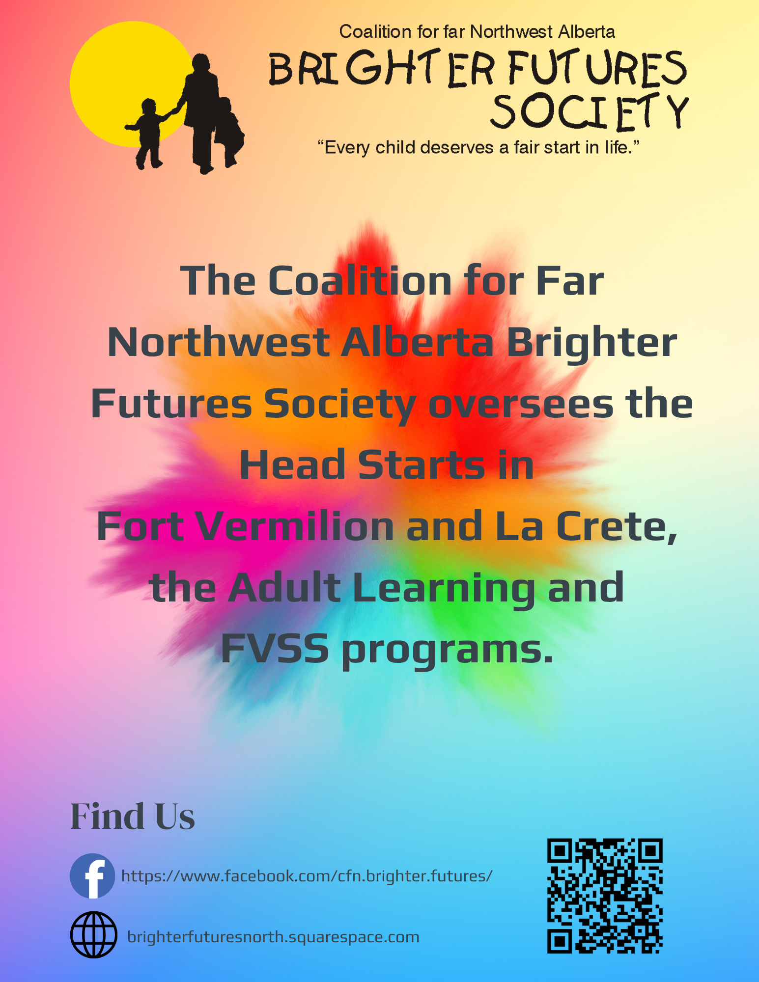 We have been serving children and their families since 1994 in Fort Vermilion and La Crete in Northwest Alberta. Our Admin office is located in Fort Vermilion on 4900 43 ave.