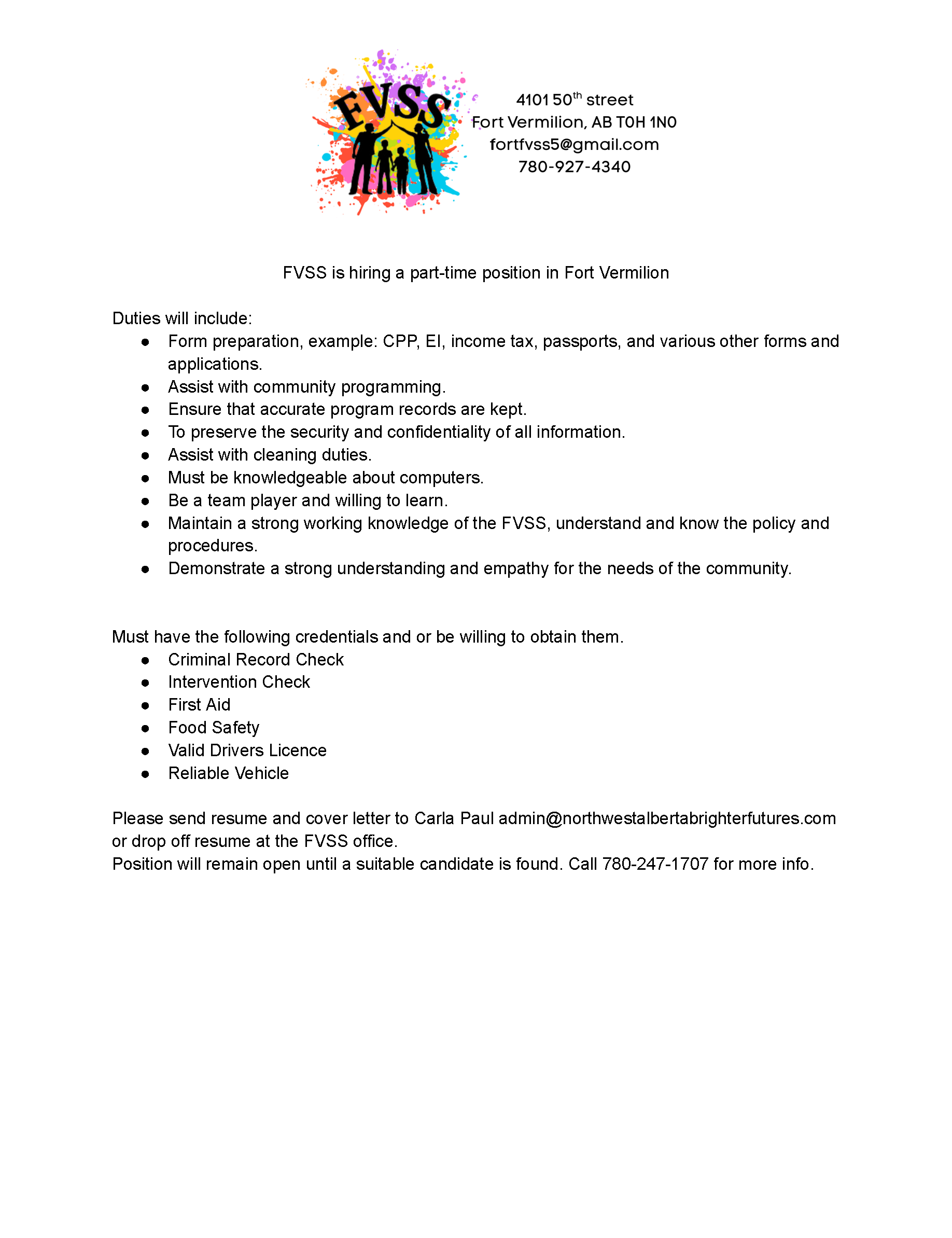 To apply, please send your resume to admin@northwestalbertabrighterfutures.com. Please be sure to include if you are applying for a La Crete or Fort Vermilion position in your resume or cover letter.