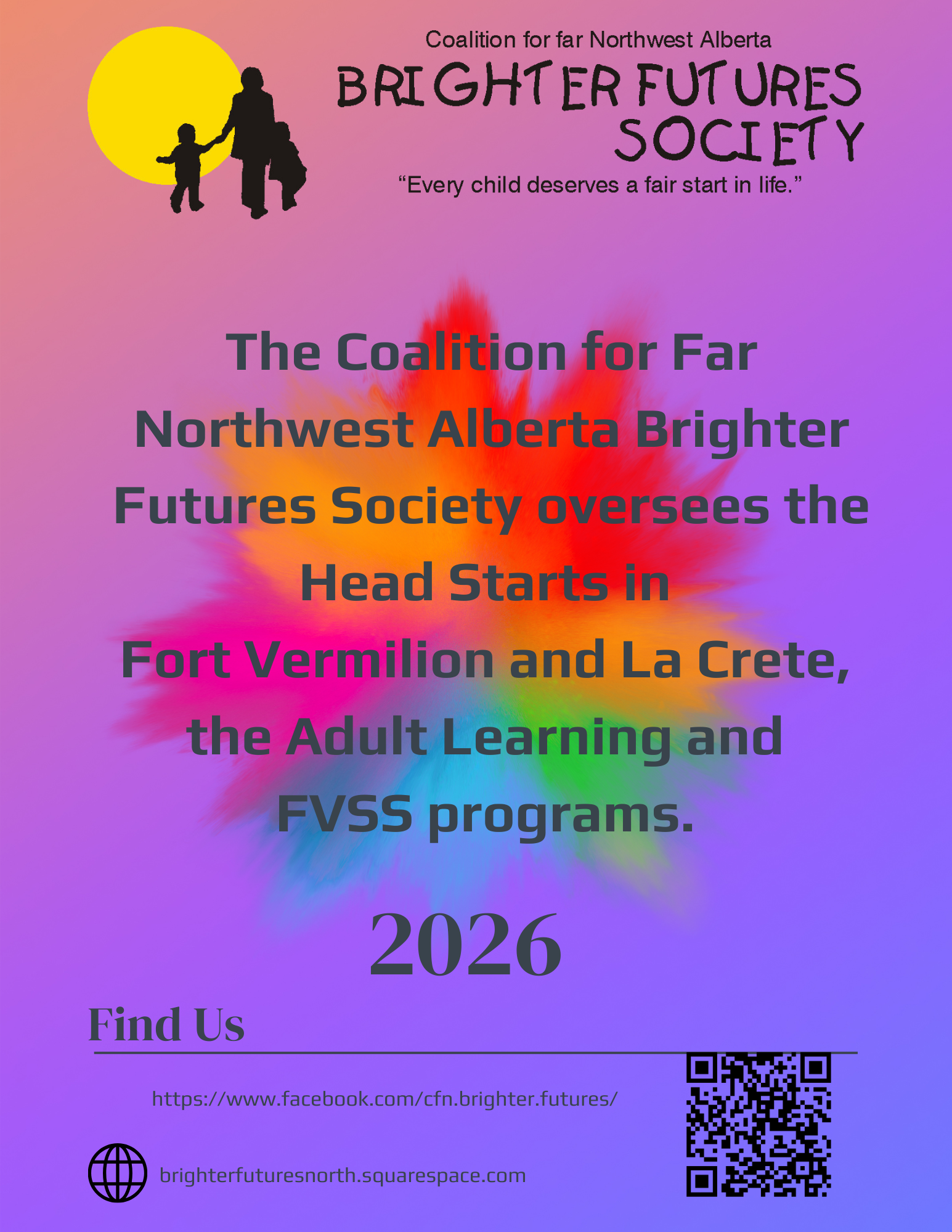 We have been serving children and their families since 1994 in Fort Vermilion and La Crete in Northwest Alberta. Our Admin office is located in Fort Vermilion on 4900 43 ave.